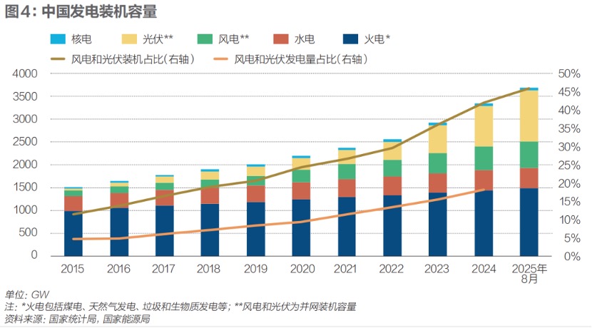 十年前,全国风电、太阳能发电累计装机仅1.7亿千瓦,占全部电源装机约11%;到2025年8月,这一数字突破16亿千瓦,历史性超越火电装机数,占全国发电装机接近半数。根据中国政府最新目标,到2035年非化石能源消费占比将达30%以上,风电和光伏装机是2020年的6倍以上。能源供给结构显著变化的同时,供需平衡、系统安全和市场机制的全面再造也被提上日程。