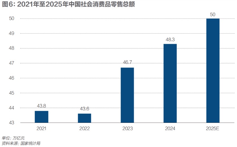 中国消费市场已经从“量”的扩展转向“质”的提升。2020年到2024年,社会消费品零售总额从39.1万亿元跃升至48.3万亿元,年均增长5.5%。这一变化不仅是收入水平的提升,还是消费理念的变革。2025年,中国社会消费品零售总额有望超过50万亿元。人均国内生产总值超过1.3万美元,更加激发了消费升级热潮。